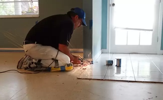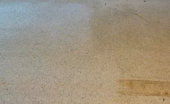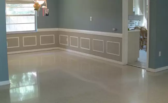 Homeowners in Gainesville, Florida decided to do some renovation. They removed two walls to create an open area and removed some old carpeting, as well. When they pulled the carpet back, they discovered a terrazzo floor underneath. The terrazzo was unsightly, though, because it was covered in carpet strips and glue, carpet tacks, and had a buildup of coatings near the walls, including the walls that had been removed. We provided a free consultation and estimate for terrazzo restoration, and they scheduled services.