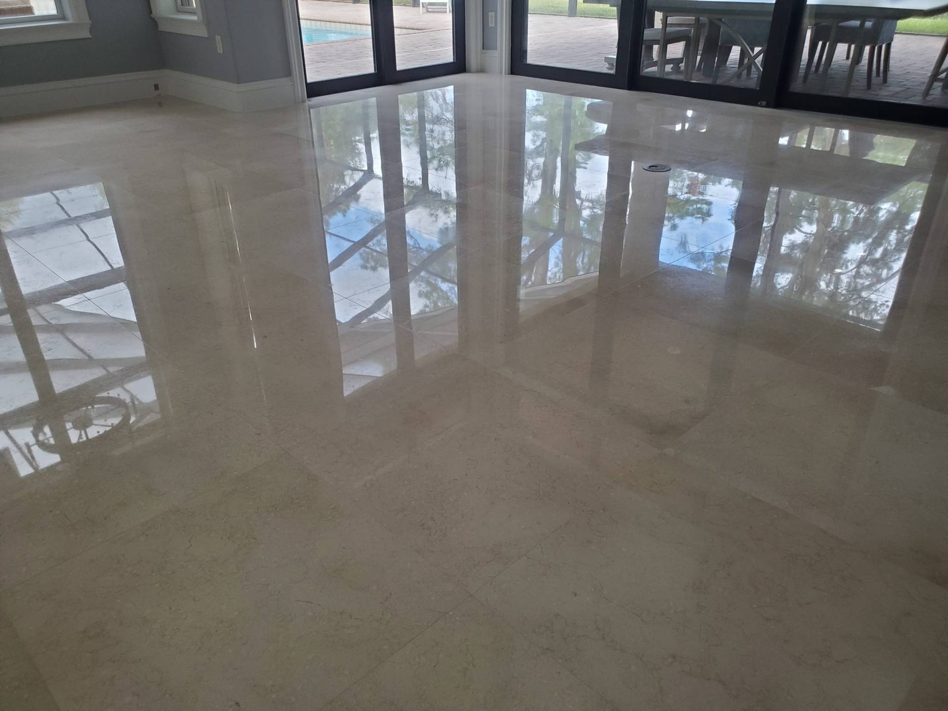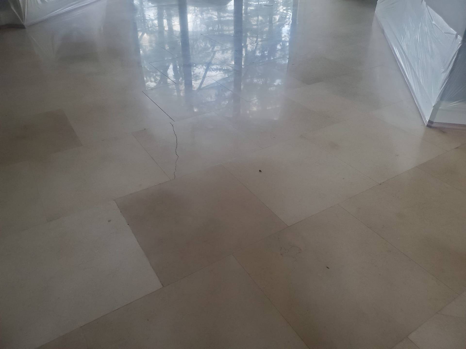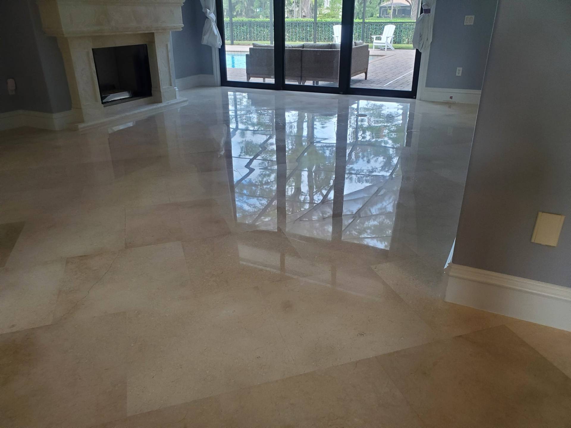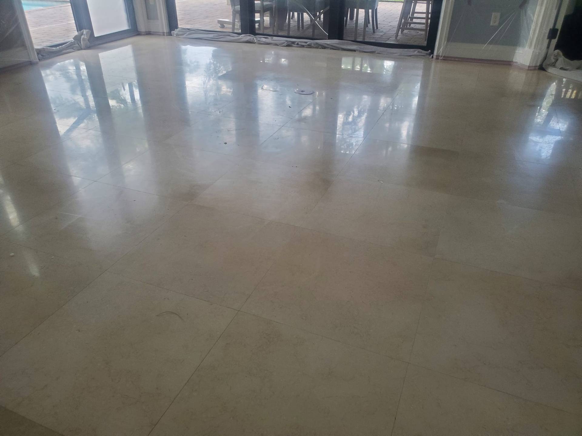 Our 10-step diamond marble restoration process brought this tired, etched Jerusalem Gold limestone back to life—revealing its natural elegance and radiant finish.
